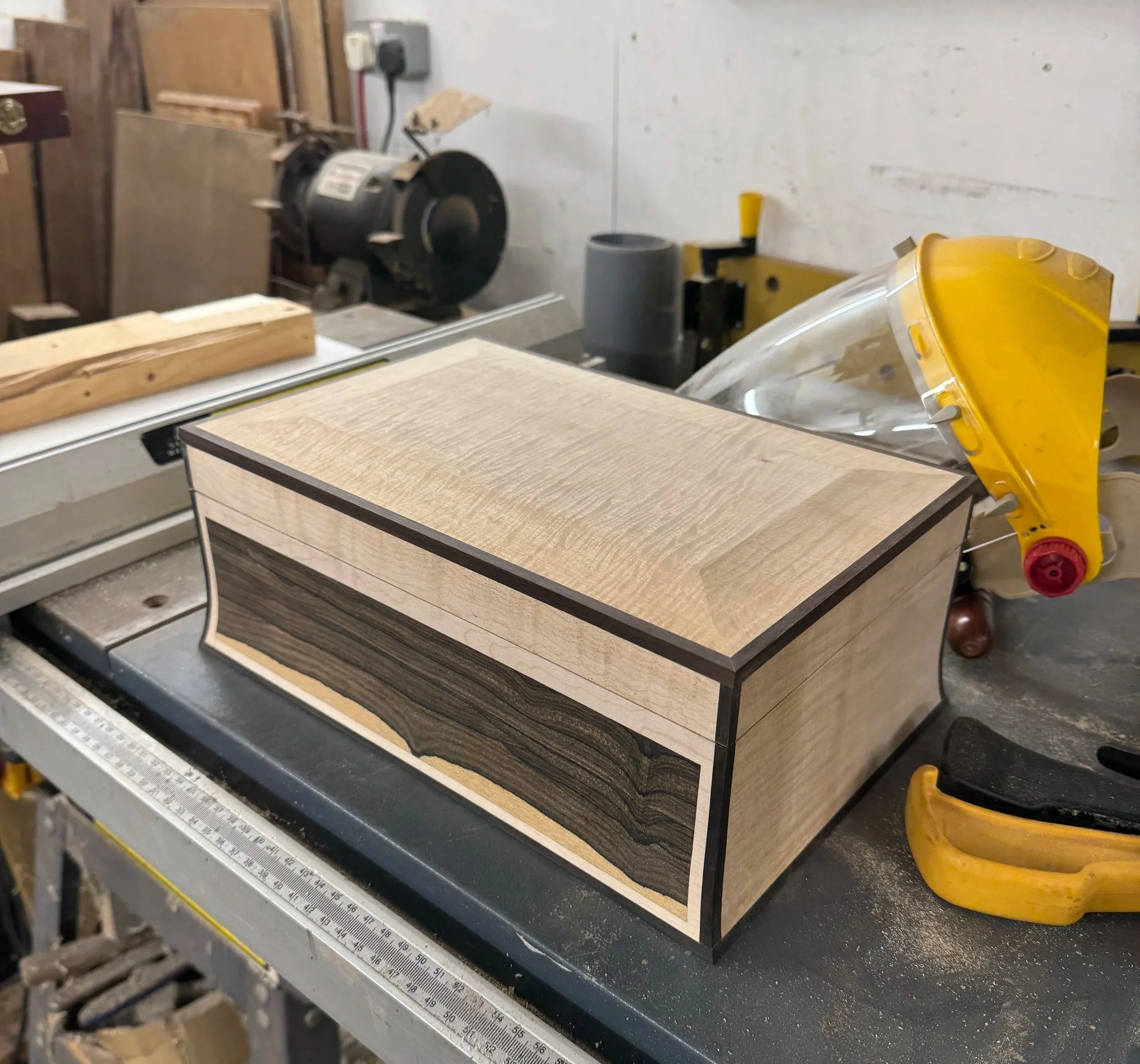 Once the lid has been cut we level the lid and the box so all surfaces touch perfectly and are aligned correctly, then the hinges and latch are fitted.